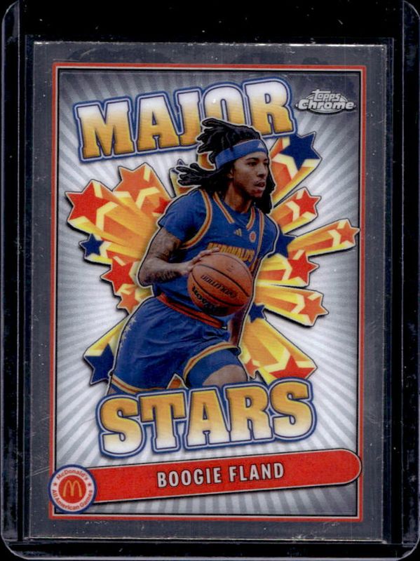 The Boogie Fland 2024 Topps Chrome McDonald's All-American #SES-JOF Major Stars card is 1 of 112 Boogie Fland's card variations in the 2024 Topps Chrome McDonald's All-American set being tracked by Sports Card Investor, including #79 Base, #29 Base, #29 Blue RayWave Refractor, #79 Blue RayWave Refractor, and #29 McDonald's Logo Refractor.