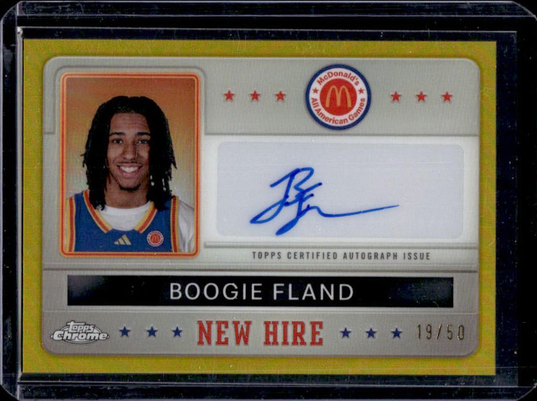The Boogie Fland 2024 Topps Chrome McDonald's All-American #NHB-JOF New Hire Badge Autographs - Gold Refractor /50 card is 1 of 112 Boogie Fland's card variations in the 2024 Topps Chrome McDonald's All-American set being tracked by Sports Card Investor, including #79 Base, #29 Base, #29 Blue RayWave Refractor, #79 Blue RayWave Refractor, and #29 McDonald's Logo Refractor.