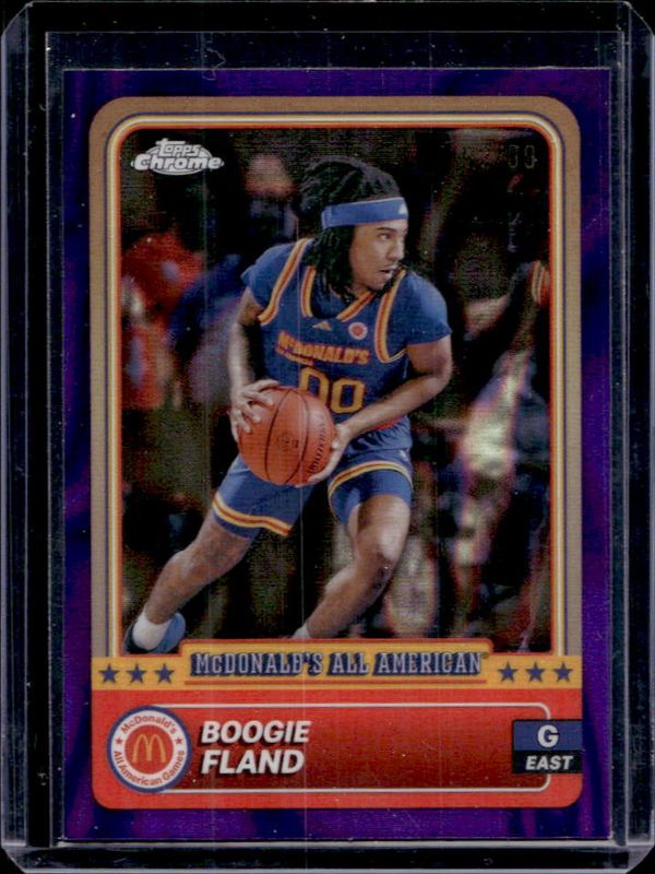 The Boogie Fland 2024 Topps Chrome McDonald's All-American #29 Purple Lava Refractor /99 card is 1 of 112 Boogie Fland's card variations in the 2024 Topps Chrome McDonald's All-American set being tracked by Sports Card Investor, including #79 Base, #29 Base, #29 Blue RayWave Refractor, #79 Blue RayWave Refractor, and #29 McDonald's Logo Refractor.