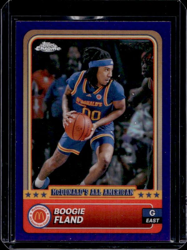 The Boogie Fland 2024 Topps Chrome McDonald's All-American #29 Purple Refractor /150 card is 1 of 112 Boogie Fland's card variations in the 2024 Topps Chrome McDonald's All-American set being tracked by Sports Card Investor, including #79 Base, #29 Base, #29 Blue RayWave Refractor, #79 Blue RayWave Refractor, and #29 McDonald's Logo Refractor.