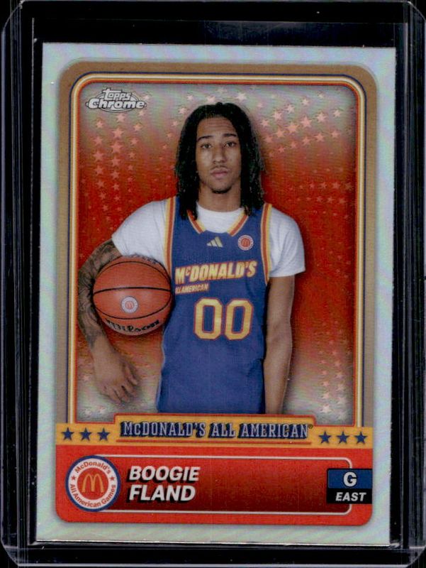 The Boogie Fland 2024 Topps Chrome McDonald's All-American #79 Refractor card is 1 of 112 Boogie Fland's card variations in the 2024 Topps Chrome McDonald's All-American set being tracked by Sports Card Investor, including #79 Base, #29 Base, #29 Blue RayWave Refractor, #79 Blue RayWave Refractor, and #29 McDonald's Logo Refractor.