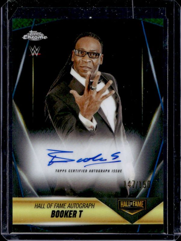 The Booker T 2025 Topps Chrome WWE #HOF-BT Hall of Fame Autographs - Blue Refractor /150 card is 1 of 13 Booker T's card variations in the 2025 Topps Chrome WWE set being tracked by Sports Card Investor, including Embedded, Hall of Fame Autographs, Hall of Fame Autographs - Refractor /175, Embedded - Gold Refractor /50, and Hall of Fame Autographs - Gold Refractor /50.