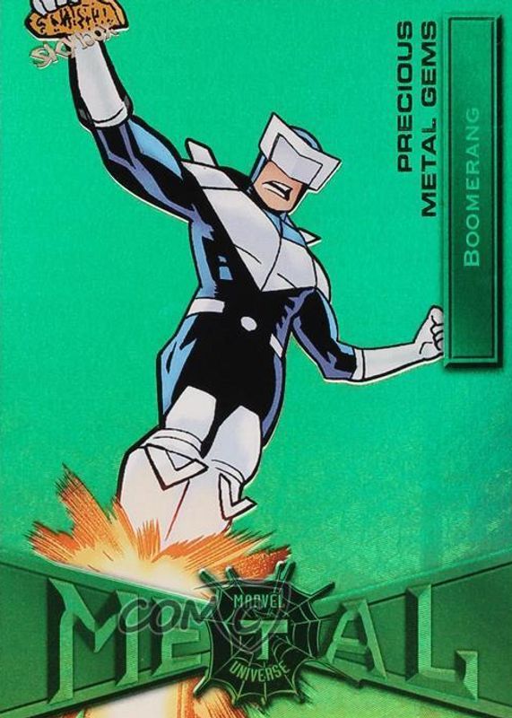 The Boomerang 2021 Skybox Marvel Metal Universe Spider-Man #14 Precious Metal Gems Green /10 card in Raw condition has not changed in price in the last 30 days and was last sold for $565.00 .