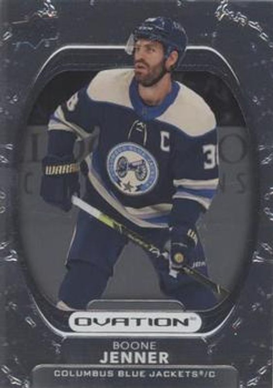 The Boone Jenner 2021 Upper Deck Ovation #100 Silver Foil card is 1 of 15 Boone Jenner's card variations in the 2021 Upper Deck Ovation set being tracked by Sports Card Investor, including Base, Checkerboard, Gold Circular Wonder, Gold Foil, and Standing Ovation /500.