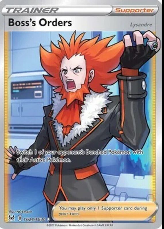 The Boss's Orders 2022 Sword & Shield: Lost Origin #TG24/TG30 Trainer Gallery card in Raw TCG (Near Mint) condition has moved up $1.56 (+19.5%) in the last 30 days and was last sold for $9.55 .