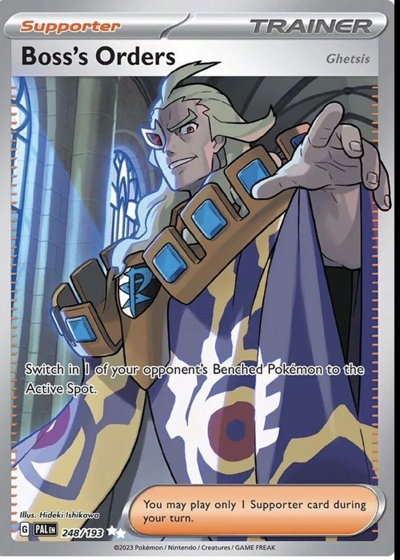 The Boss's Orders 2023 Scarlet & Violet: Paldea Evolved #248/193 Ultra Rare (Full Art) card in Raw TCG (Near Mint) condition has moved up $1.50 (+20.0%) in the last 30 days and was last sold for $9.00 .