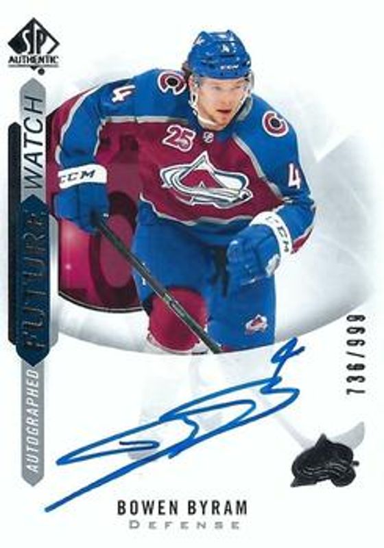 The Bowen Byram 2020 SP Authentic #197 Base /999 Rookie card is 1 of 17 Bowen Byram's card variations in the 2020 SP Authentic set being tracked by Sports Card Investor, including Base /999, Black Gold Ink, Future Watch Acetate, Limited Autographs, and 2000 Retro Sign of the Times Rookies.