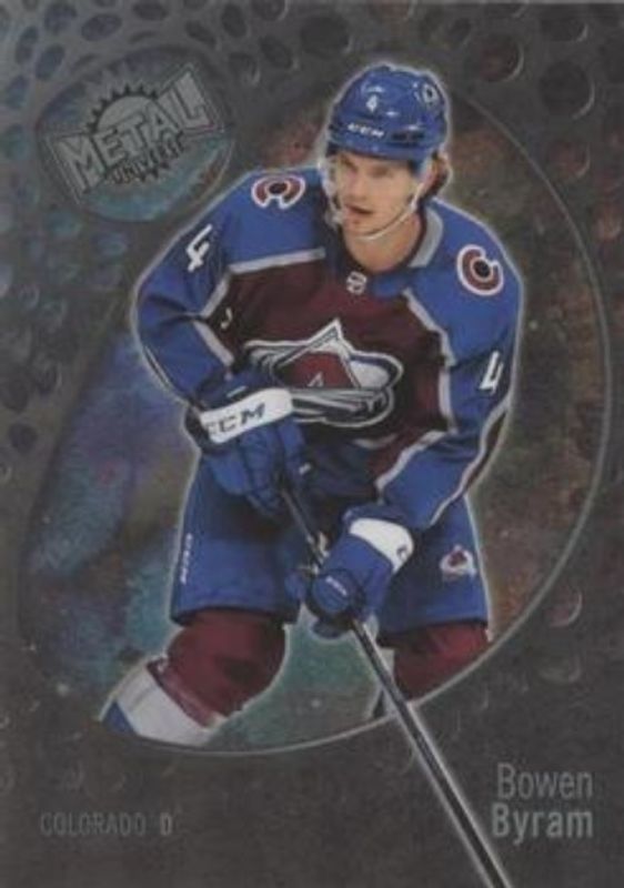 The Bowen Byram 2022 Metal Universe #94 Spectrum FX card is 1 of 14 Bowen Byram's card variations in the 2022 Metal Universe set being tracked by Sports Card Investor, including Base, Spectrum FX Blue, Spectrum FX Purple /199, Precious Metal Gems Green /100, and Precious Metal Gems Red /100.