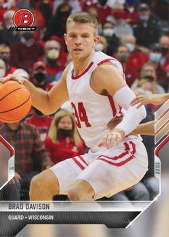 The Brad Davison 2021 Bowman Next #13 Base card is 1 of 12 Brad Davison's card variations in the 2021 Bowman Next set being tracked by Sports Card Investor, including Blue /49, Purple /25, Red /10, Orange /5, and Gold /1.