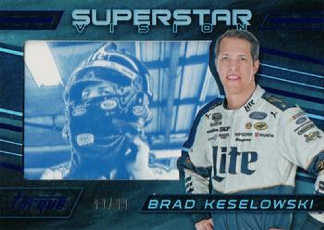 The Brad Keselowski 2016 Torque NASCAR #SV11 Superstar Vision Blue /99 card is 1 of 132 Brad Keselowski's card variations in the 2016 Torque NASCAR set being tracked by Sports Card Investor, including #87 Base, #11 Base, #61 Base, #87 Gold, and #61 Gold.