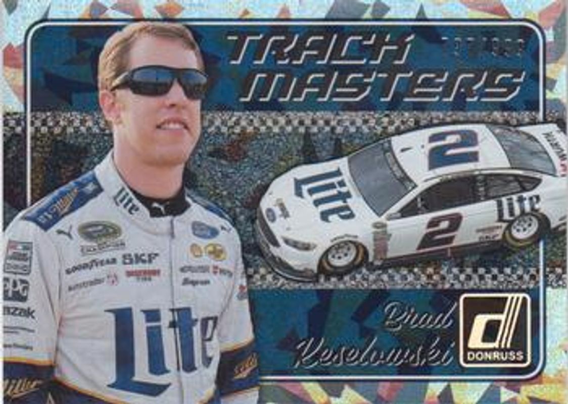 The Brad Keselowski 2017 Donruss NASCAR #TM8 Track Masters Cracked Ice /999 card is 1 of 85 Brad Keselowski's card variations in the 2017 Donruss NASCAR set being tracked by Sports Card Investor, including #127 Base, #98 Base, #9 Base, #39 Base, and #149 Base.