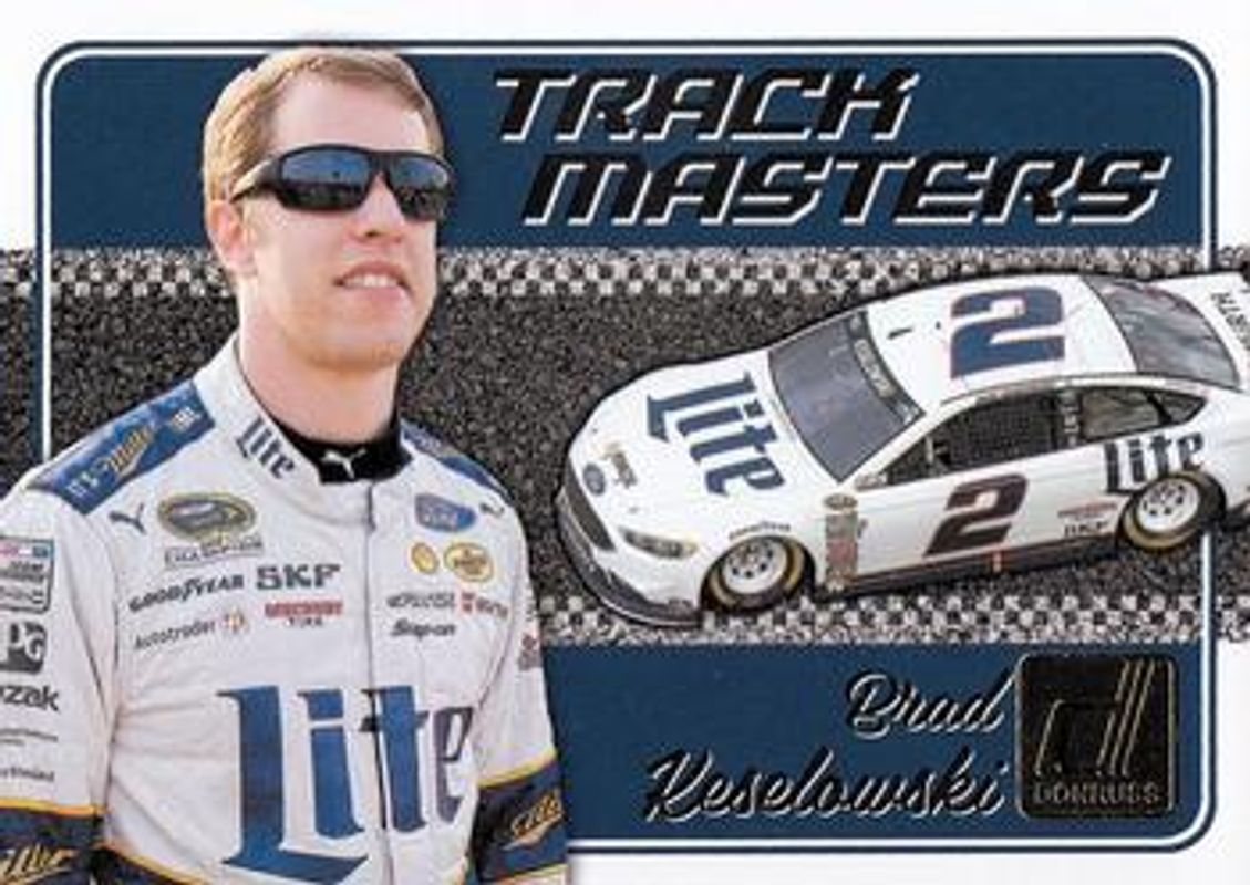 The Brad Keselowski 2017 Donruss NASCAR #TM8 Track Masters card is 1 of 85 Brad Keselowski's card variations in the 2017 Donruss NASCAR set being tracked by Sports Card Investor, including #127 Base, #98 Base, #9 Base, #39 Base, and #149 Base.