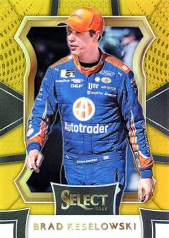 The Brad Keselowski 2017 Select NASCAR #9 Gold /10 card is 1 of 93 Brad Keselowski's card variations in the 2017 Select NASCAR set being tracked by Sports Card Investor, including #10 Base, #9 Base, #8 Base, #7 Base, and #120 Base.