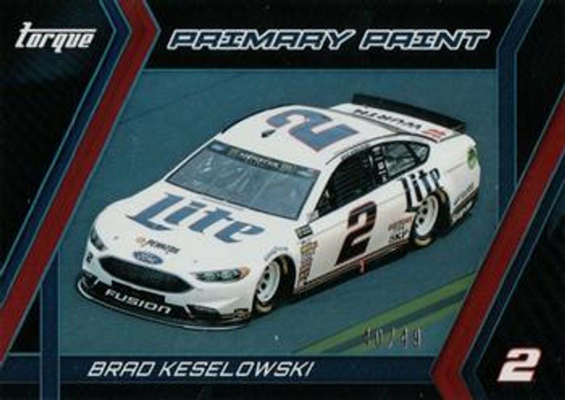 The Brad Keselowski 2017 Torque NASCAR #PP13 Primary Paint Red /49 card is 1 of 146 Brad Keselowski's card variations in the 2017 Torque NASCAR set being tracked by Sports Card Investor, including #44 Base, #65 Base, #2 Base, #2 Gold, and #65 Gold.