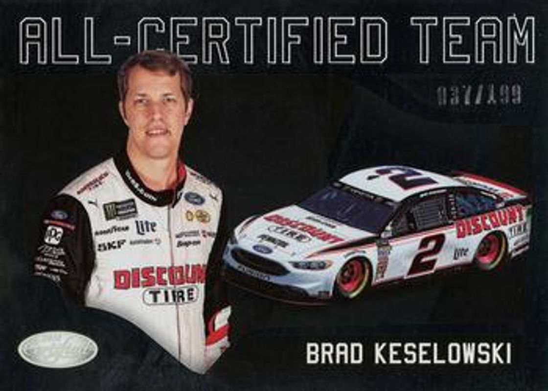 The Brad Keselowski 2018 Certified NASCAR #ACT19 All Certified Team /199 card is 1 of 82 Brad Keselowski's card variations in the 2018 Certified NASCAR set being tracked by Sports Card Investor, including #96 Base /149, #73 Base /149, #96 Orange /249, #73 Orange /249, and #73 Mirror Gold /25.