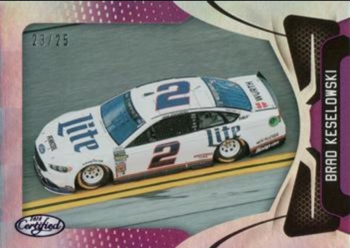 The Brad Keselowski 2018 Certified NASCAR #96 Purple /10 card is 1 of 82 Brad Keselowski's card variations in the 2018 Certified NASCAR set being tracked by Sports Card Investor, including #96 Base /149, #73 Base /149, #96 Orange /249, #73 Orange /249, and #73 Mirror Gold /25.