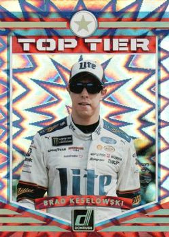 The Brad Keselowski 2018 Donruss NASCAR #TT8 Top Tier Xplosion /99 card is 1 of 76 Brad Keselowski's card variations in the 2018 Donruss NASCAR set being tracked by Sports Card Investor, including #122 Base, #88 Base, #5 Base, #32b Base, and #32a Base.