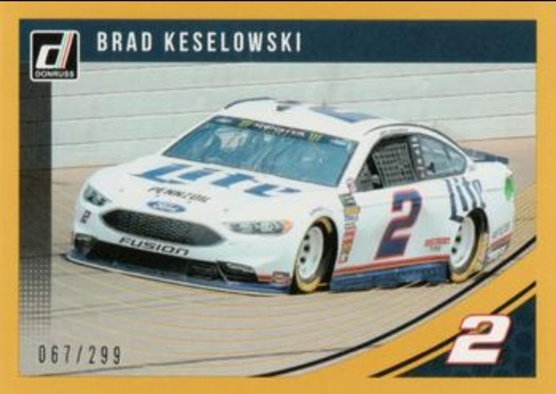 The Brad Keselowski 2019 Donruss NASCAR #90 Gold /299 card is 1 of 60 Brad Keselowski's card variations in the 2019 Donruss NASCAR set being tracked by Sports Card Investor, including #90 Base, #113 Base, #90 Silver, #113 Silver, and #2 Gold /299.