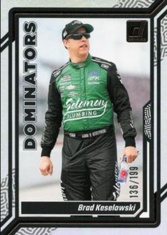 The Brad Keselowski 2024 Donruss NASCAR #17 Dominators Holo /199 card is 1 of 179 Brad Keselowski's card variations in the 2024 Donruss NASCAR set being tracked by Sports Card Investor, including #192 Base, #86 Base, #8a Base, #8b Base, and #185 Base.