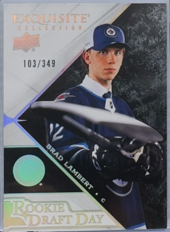 The Brad Lambert 2024 Upper Deck Black Diamond #RDD-BL Exquisite Collection Rookie Draft Day /349 card is 1 of 33 Brad Lambert's card variations in the 2024 Upper Deck Black Diamond set being tracked by Sports Card Investor, including Base /349, Diamond Relic Rookies /99, Premium Relics /50, Diamond Relic Rookies Emerald /10, and Emerald /10.
