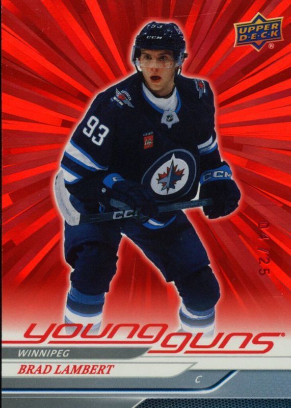 This card is 1 of 8 Brad Lambert's card variations in the 2024 Upper Deck set being tracked by Sports Card Investor, including Young Guns Base, Young Guns - Clear Cut, Young Guns - Outburst Silver, Young Guns - Deluxe /250, and Young Guns - UD Exclusives /100.