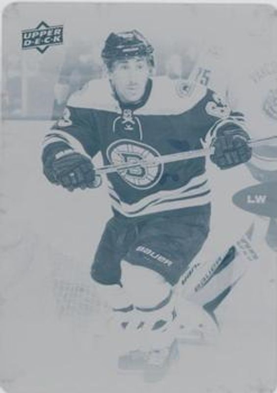 The Brad Marchand 2016 Upper Deck MVP #119 Printing Plate Cyan /1 card is 1 of 12 Brad Marchand's card variations in the 2016 Upper Deck MVP set being tracked by Sports Card Investor, including Base, Colors & Contours, Green Script, Puzzle Back, and Silver Script.