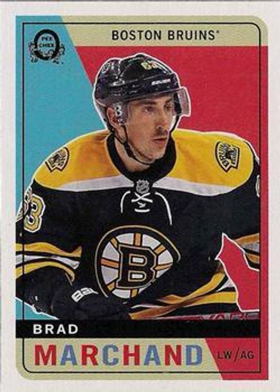 The Brad Marchand 2017 O-Pee-Chee #205 Retro Blank Back card is 1 of 14 Brad Marchand's card variations in the 2017 O-Pee-Chee set being tracked by Sports Card Investor, including Base, Rainbow Foil, Red, Retro, and Black Rainbow Foil /100.