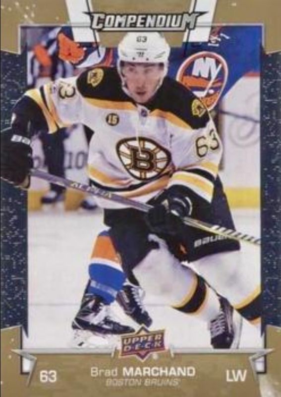 The Brad Marchand 2017 Upper Deck Compendium #SP8 SP Achievements - Gold card is 1 of 10 Brad Marchand's card variations in the 2017 Upper Deck Compendium set being tracked by Sports Card Investor, including Blue, Gold, Printing Plates Black /1, Printing Plates Cyan /1, and Printing Plates Magenta /1.