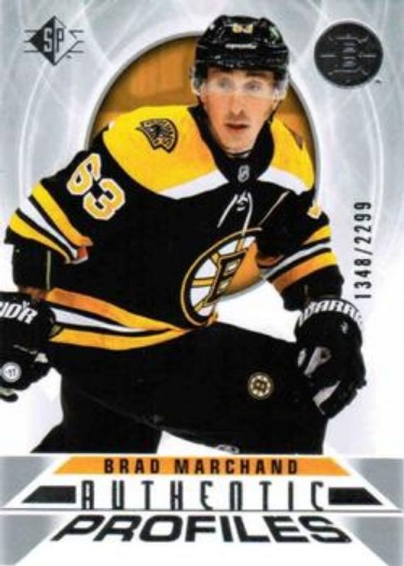 The Brad Marchand 2020 SP #AP-7 Authentic Profiles /2299 card is 1 of 14 Brad Marchand's card variations in the 2020 SP set being tracked by Sports Card Investor, including Base /2299, Blue, Authentic Profiles - Blue, Authentic Profiles Jersey, and Authentic Profiles - Pyrotechnic Gold.