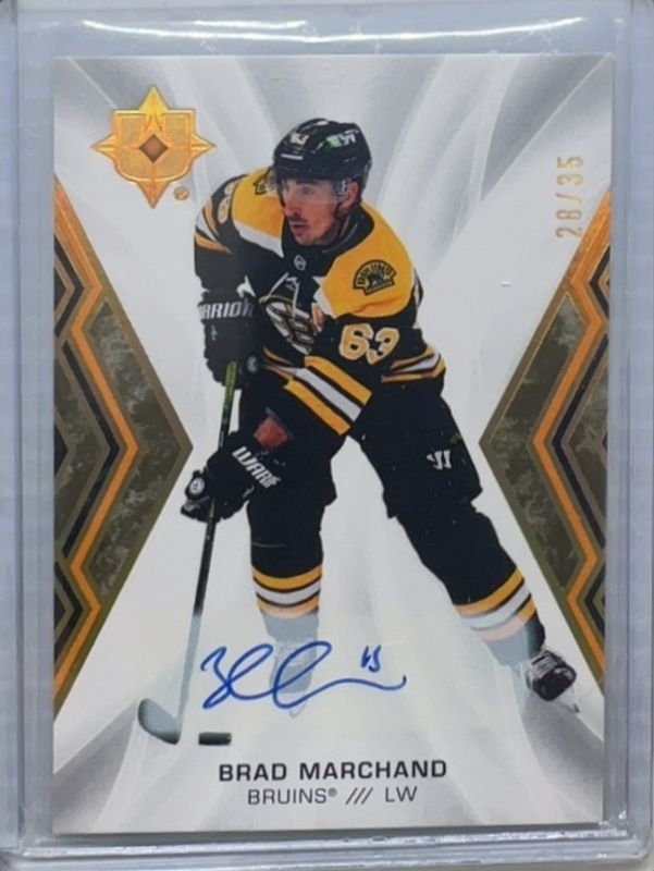 The Brad Marchand 2021 Upper Deck Ultimate Collection #63 Autographs - Gold /15 card is 1 of 14 Brad Marchand's card variations in the 2021 Upper Deck Ultimate Collection set being tracked by Sports Card Investor, including Base /299, Gold /35, Purple /15, Black /5, and 2000 Ultimate Signatures Retro.