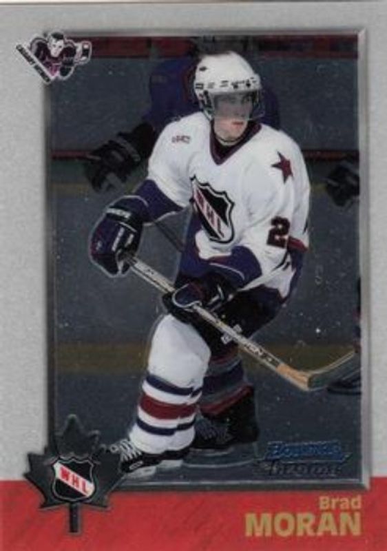 The Brad Moran 1998 Bowman Chrome CHL #72 Base card is 1 of 6 Brad Moran's card variations in the 1998 Bowman Chrome CHL set being tracked by Sports Card Investor, including OPC International, OPC International Refractor, Refractor, Golden Anniversary /50, and Golden Anniversary Refractor /5.