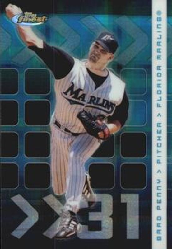 The Brad Penny 2002 Topps Finest #10 X-Fractor /299 card is 1 of 3 Brad Penny's card variations in the 2002 Topps Finest set being tracked by Sports Card Investor, including Base, and Refractor /499.
