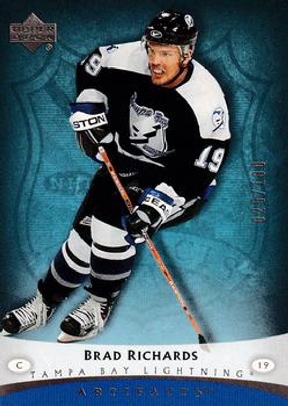 The Brad Richards 2005 Upper Deck Artifacts #89 Pewter /100 card is 1 of 34 Brad Richards' card variations in the 2005 Upper Deck Artifacts set being tracked by Sports Card Investor, including Base /750, Blue /75, Red /50, Green /25, and Gold /1.