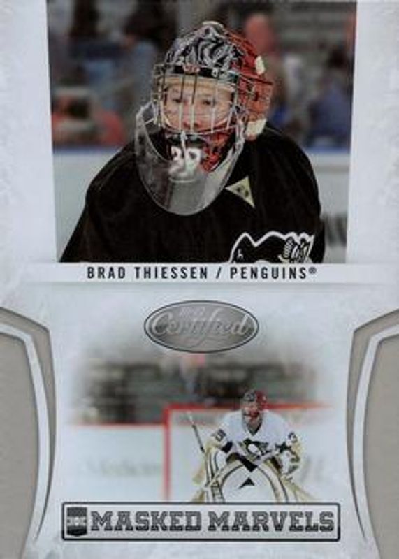 The Brad Thiessen 2010 Certified #15 Masked Marvels /500 Rookie card is 1 of 17 Brad Thiessen's card variations in the 2010 Certified set being tracked by Sports Card Investor, including Base /799, Mirror Red /100, Mirror Blue /50, Mirror Gold /25, and Expo 10 Promos: Masked Marvels /5.