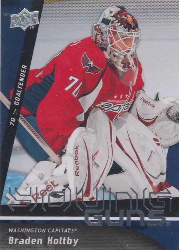 The Braden Holtby 2009 Upper Deck #499 Young Guns Base Rookie card in Raw condition has moved down -$0.10 (-0.6%) in the last 30 days and was last sold for $17.99 .