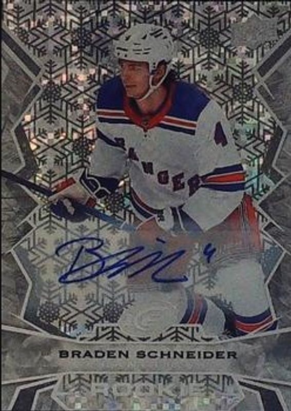 The Braden Schneider 2022 Upper Deck Ice #119 Autographs White Snowflake Rookie card is 1 of 38 Braden Schneider's card variations in the 2022 Upper Deck Ice set being tracked by Sports Card Investor, including #237 Base /1299, #119 Base /1299, #119 Gold, #119 Green, and #119 Ice Blue.