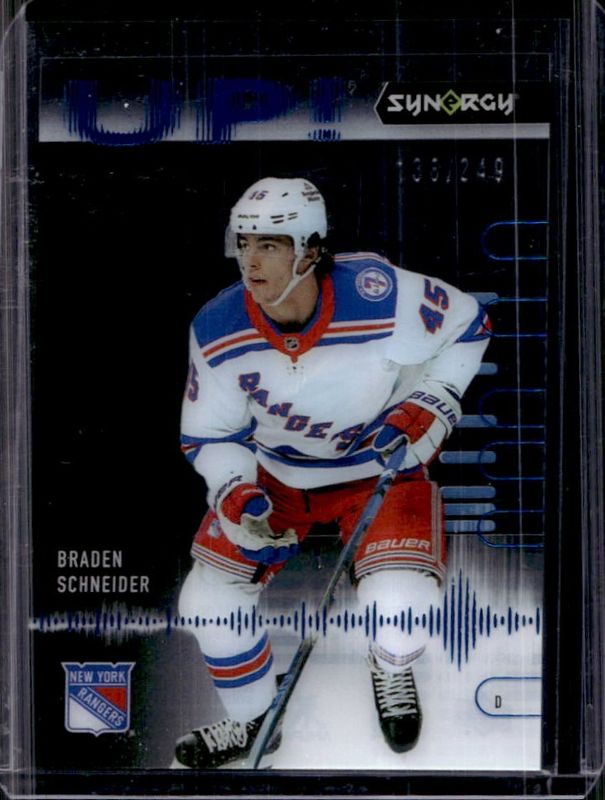 The Braden Schneider 2022 Upper Deck Synergy #CU-BS Cranked Up - Blue /249 Rookie card is 1 of 35 Braden Schneider's card variations in the 2022 Upper Deck Synergy set being tracked by Sports Card Investor, including #76 Base /23, #125 Base /23, #125 Red, #76 Red, and #125 Red Codes.