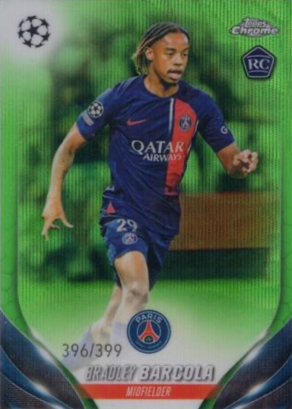The Bradley Barcola 2023 Topps Chrome UEFA Club Competitions #69 Neon Green Wave Refractor /399 Rookie card in Raw condition has not changed in price in the last 30 days and was last sold for $0.99 .
