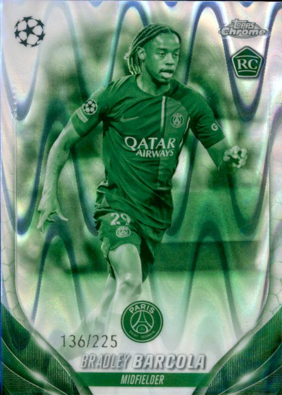 The Bradley Barcola 2023 Topps Chrome UEFA Club Competitions #69 Night Vision RayWave Refractor /225 Rookie card in Raw condition has not changed in price in the last 30 days and was last sold for $4.00 .