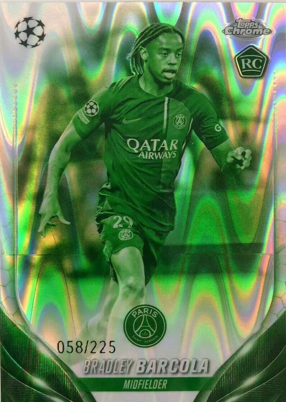 The Bradley Barcola 2023 Topps Chrome UEFA Club Competitions #69 Refractor Rookie card in Raw condition has not changed in price in the last 30 days and was last sold for $1.99 .