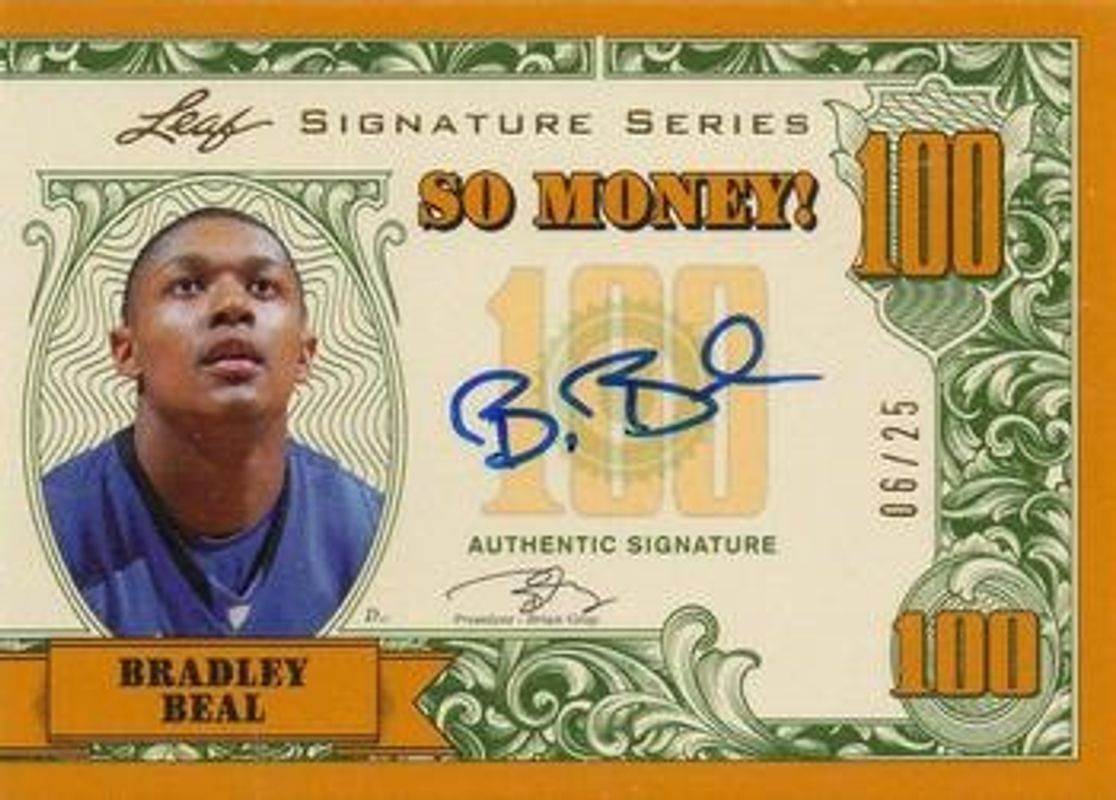 The Bradley Beal 2012 Leaf Signature Series #SM-BB1 So Money! - Gold /25 Rookie card is 1 of 52 Bradley Beal's card variations in the 2012 Leaf Signature Series set being tracked by Sports Card Investor, including Base, Silver /99, Gold /25, Blue /10, and Red /5.