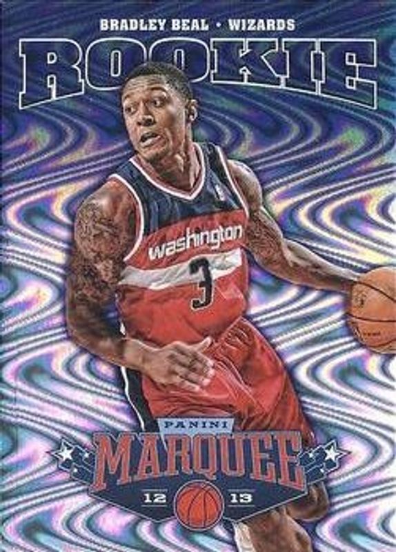 The Bradley Beal 2012 Marquee #154 Base Rookie card is 1 of 11 Bradley Beal's card variations in the 2012 Marquee set being tracked by Sports Card Investor, including #464 Base, #394 Base, #314 Base, #234 Base, and #234 Black Holoboard.