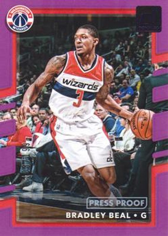 The Bradley Beal 2017 Donruss #150 Press Proof Purple /199 card is 1 of 16 Bradley Beal's card variations in the 2017 Donruss set being tracked by Sports Card Investor, including Base, Green Flood, Holo Green & Yellow Laser, Holo Orange Laser, and Press Proof Silver /299.