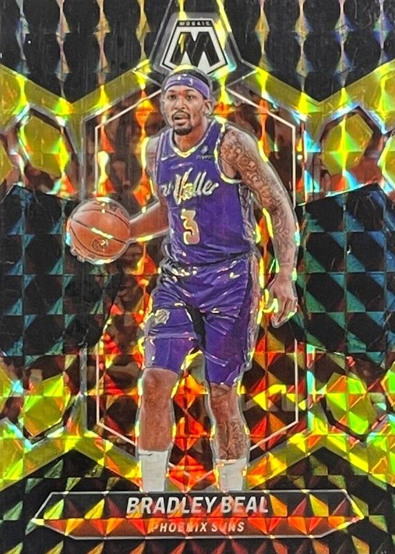 This card is 1 of 16 Bradley Beal's card variations in the 2023 Mosaic set being tracked by Sports Card Investor, including Choice Peacock /(SSP), Genesis /(SSP), Glitter /(SSP), White Sparkle /(SSP), and Fast Break Gold /10.