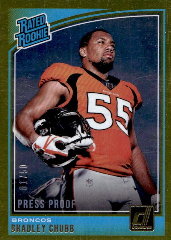 The Bradley Chubb 2018 Donruss #319 Press Proof Gold /50 Rookie card in Raw condition has not changed in price in the last 30 days and was last sold for $5.99 .