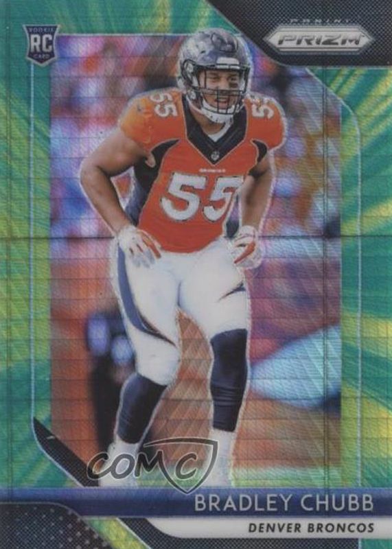 This card is 1 of 55 Bradley Chubb's card variations in the 2018 Prizm set being tracked by Sports Card Investor, including Base, Disco, Green, Lazer, and Neon Green Pulsar.