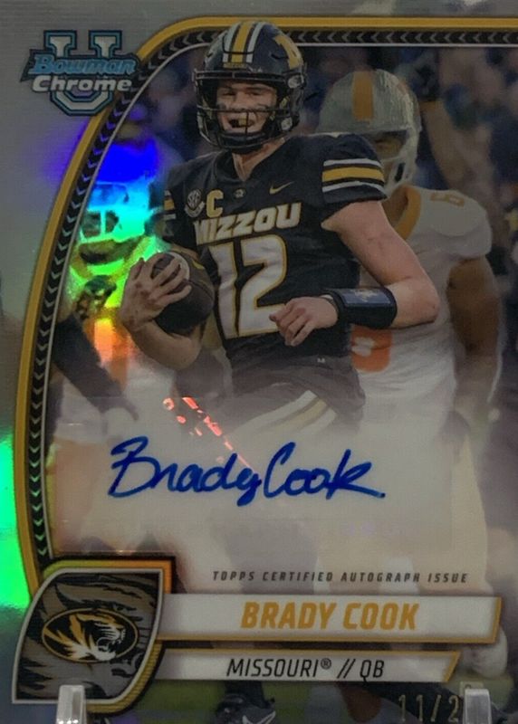 This card is 1 of 17 Brady Cook's card variations in the 2024 Bowman Chrome University set being tracked by Sports Card Investor, including Image Variation, Prospect Auto, Prospect Auto - Stealth Refractor, Prospect Auto - Refractor /299, and Prospect Auto - Fuchsia Refractor /150.