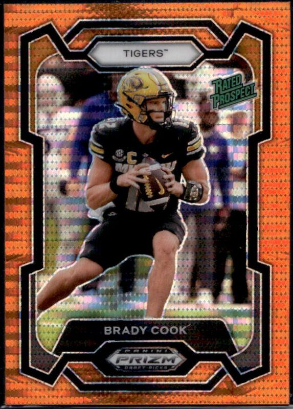 The Brady Cook 2024 Prizm Draft Picks #187 Orange Pulsar /49 card is 1 of 43 Brady Cook's card variations in the 2024 Prizm Draft Picks set being tracked by Sports Card Investor, including Base, Green, Purple Wave, Red Ice, and Ruby Wave.