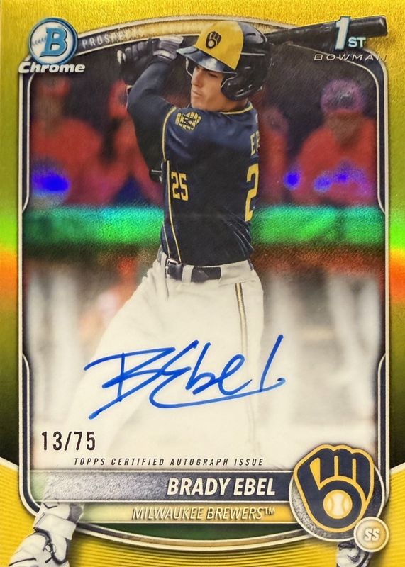 Best Prices Available For Sale of Brady Ebel 2025 Bowman Draft #CPA-BE Chrome Prospect Auto - Yellow Refractor /75 (1st)