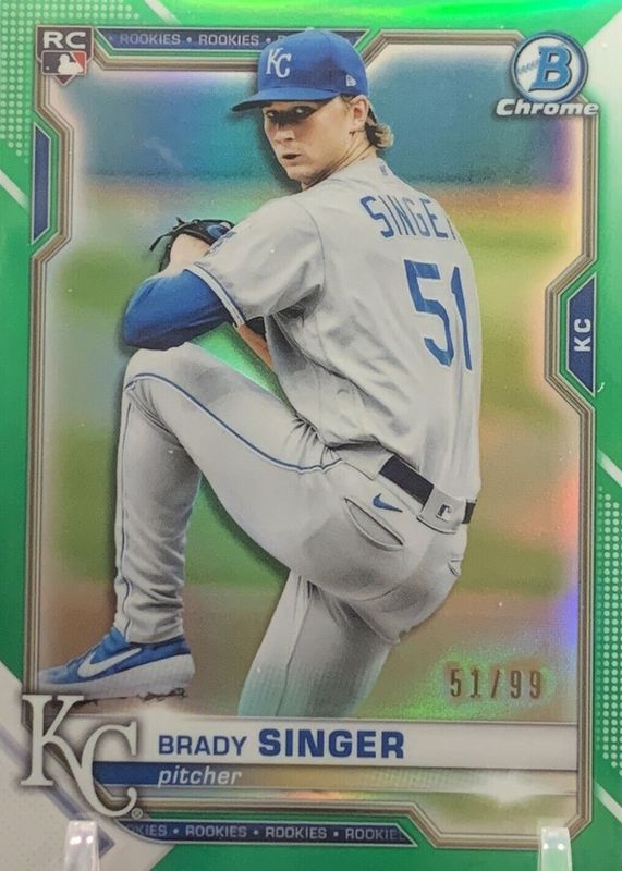 The Brady Singer 2021 Bowman Chrome #43 Green Refractor /99 Rookie card in Raw condition has not changed in price in the last 30 days and was last sold for $5.98 .